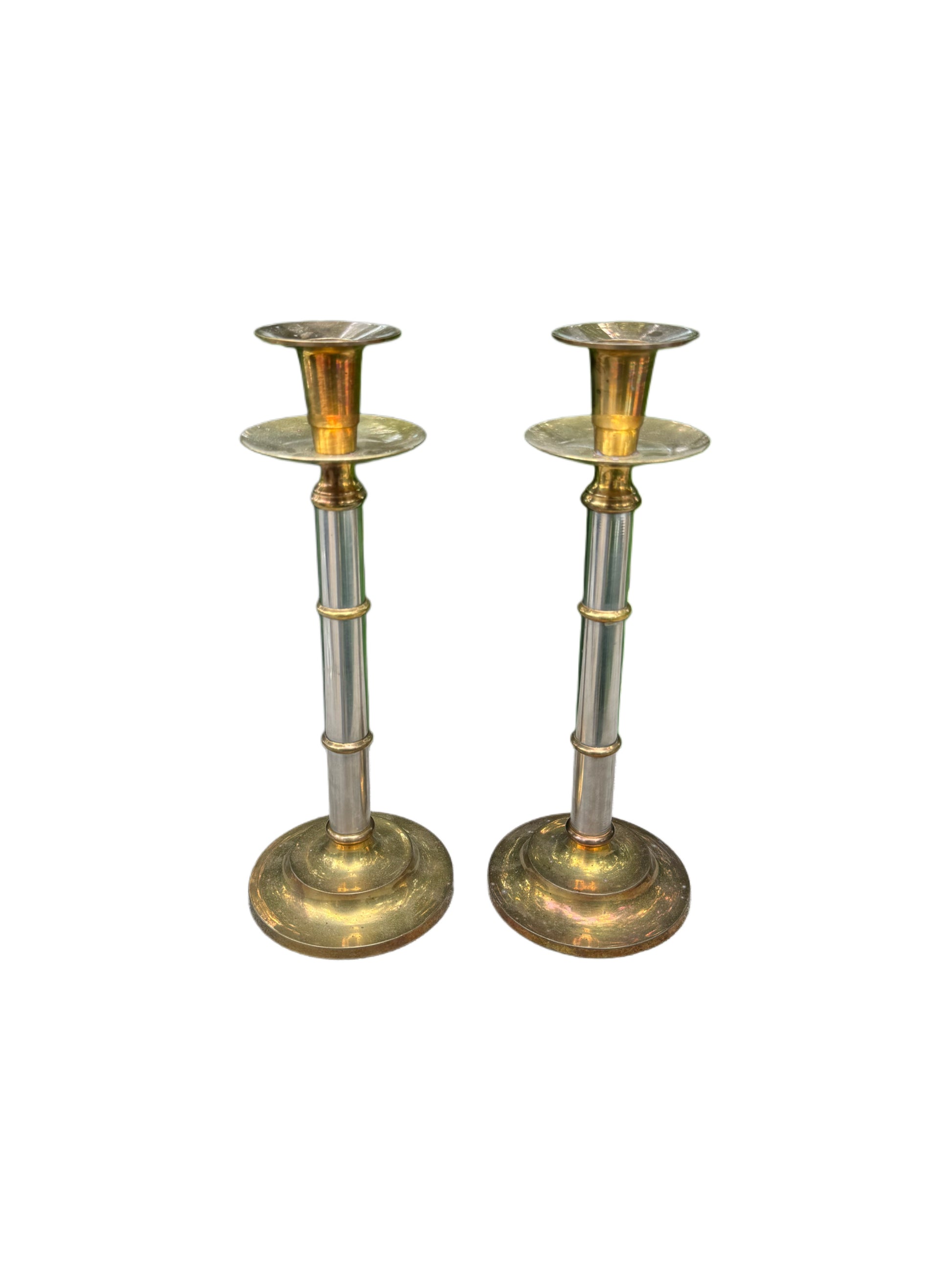 This pair of brass and chrome candlestick holders add a touch of sophistication to your décor. Perfect for adding ambiance and style to any dinner party or gathering.