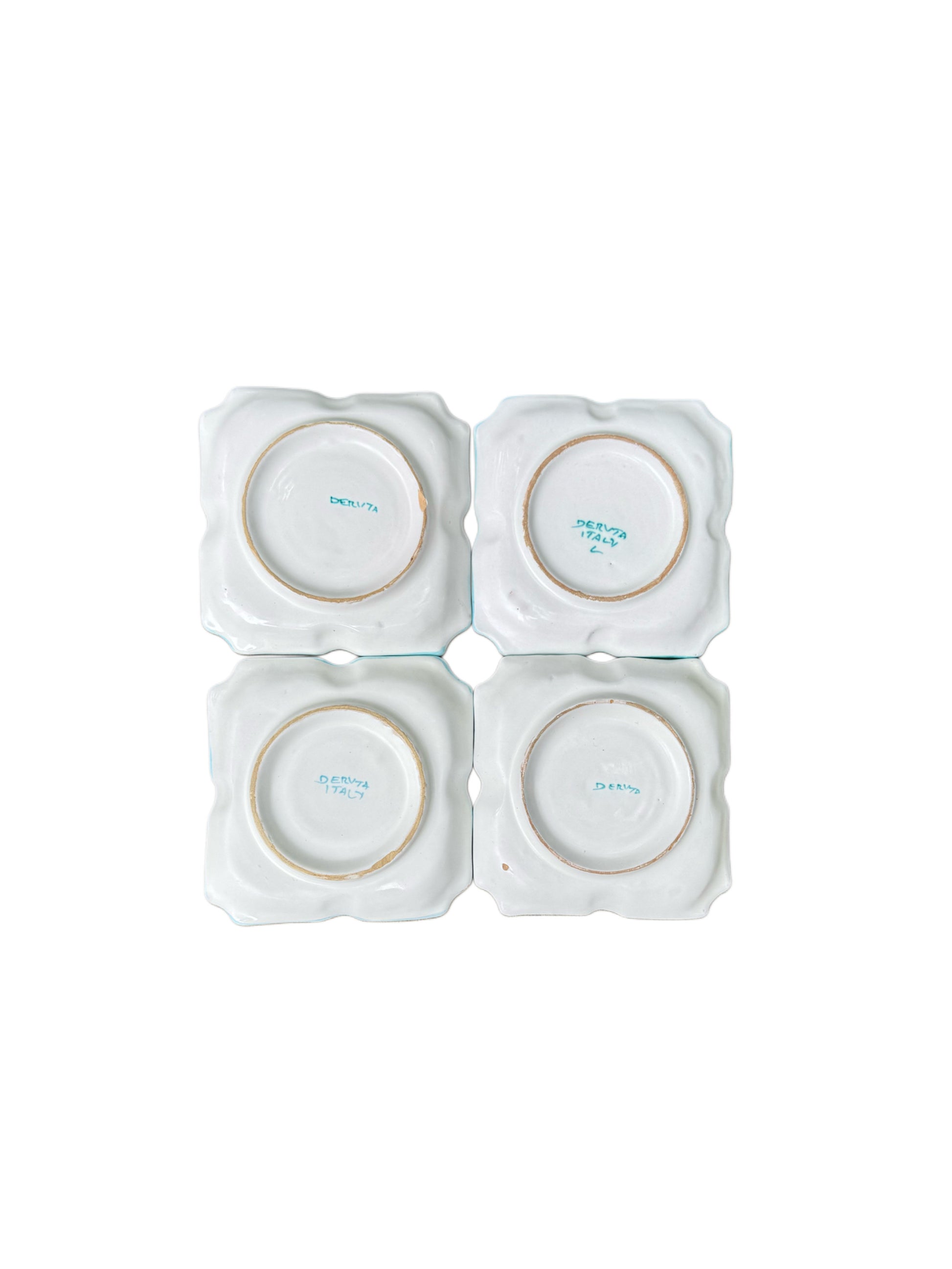 This set of four Italian Deruta Plates features a rich green color and showcases the renowned Deruta craftsmanship. Perfectly sized for trinkets or appetizer servings, these plates also make an elegant wall display when arranged as a set. Their intricate hand-painted designs reflect Italy’s artistic heritage, adding a sophisticated touch to any space or occasion.