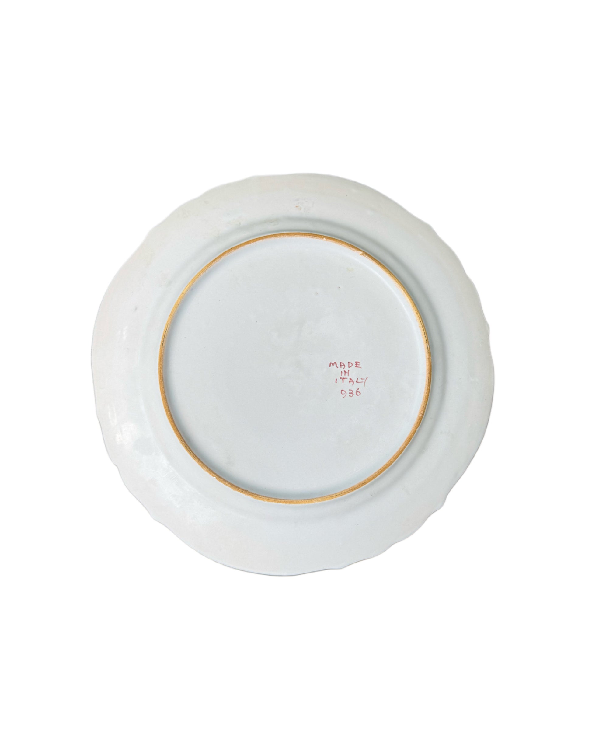 This Italian Garofano Plate showcases classic vintage craftsmanship. Its detailed garofano or carnation motif, reflects traditional Italian artistry, making it a distinguished piece for collectors or those seeking to enrich their tableware with cultural heritage. Crafted for both display and functional use, it adds a refined touch to any dining setting.
