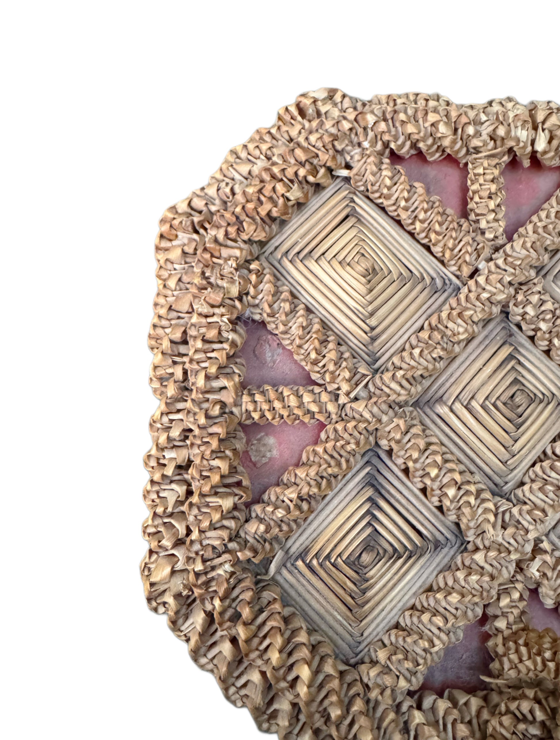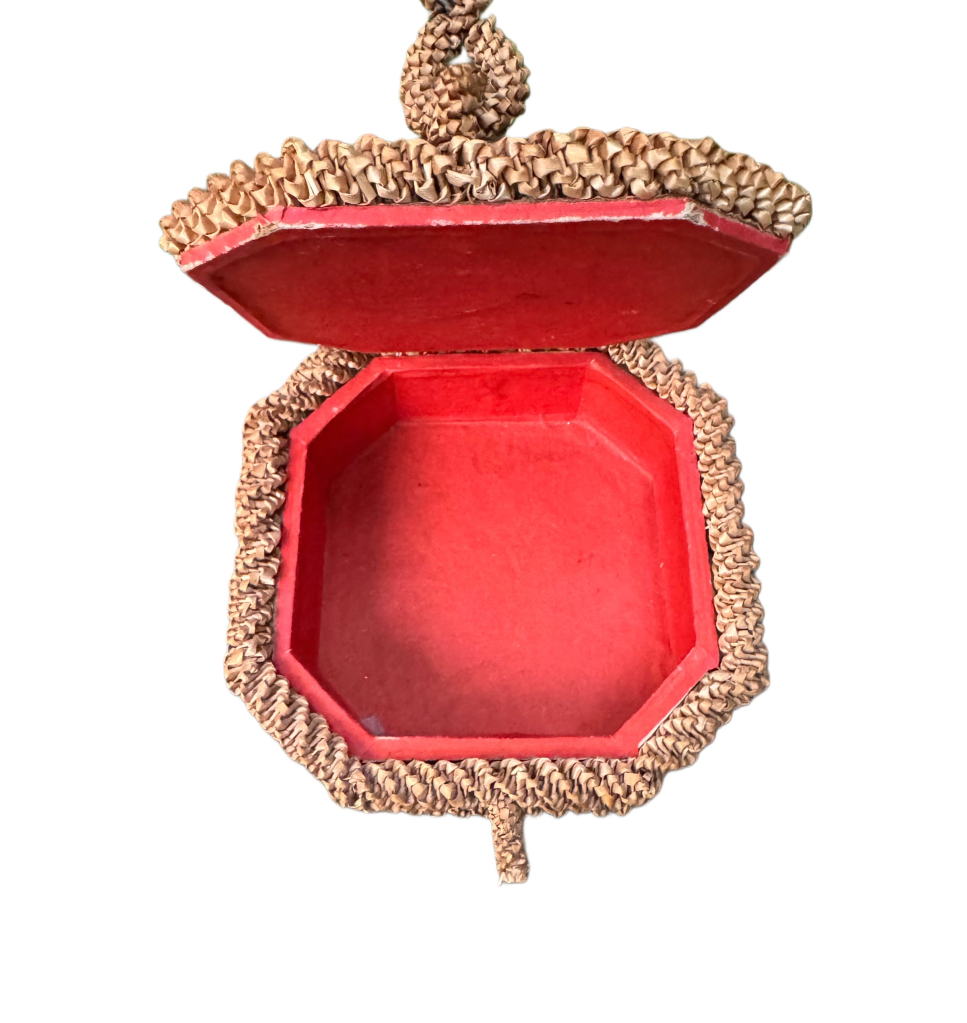 This Vintage Folk Art Rattan Box, possibly an antique Victorian-era sewing box, showcases intricate craftsmanship with its natural rattan weave, complemented by a paper box and wooden base. Its detailed design reflects traditional folk artistry, making it a unique collectible that combines both functionality and historical charm. Ideal for collectors or those appreciating unique decorative storage solutions.